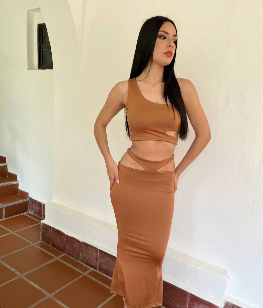 - Falda larga con recortes en la cintura: Perfecta para destacar la silueta, con un corte que aporta movimiento y frescura a tu look.